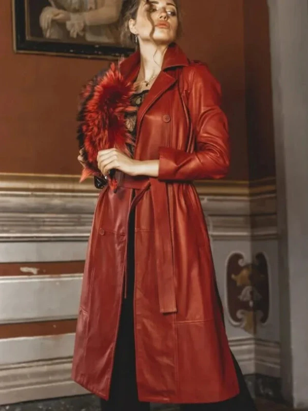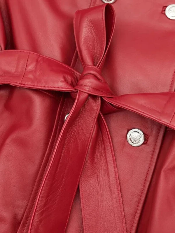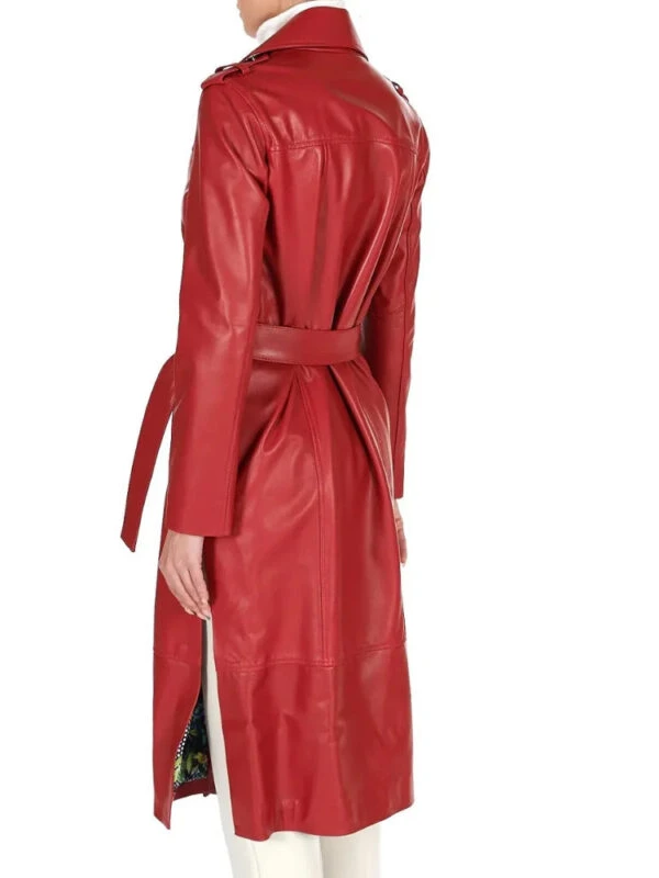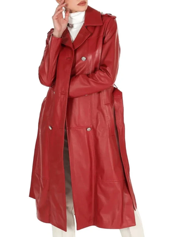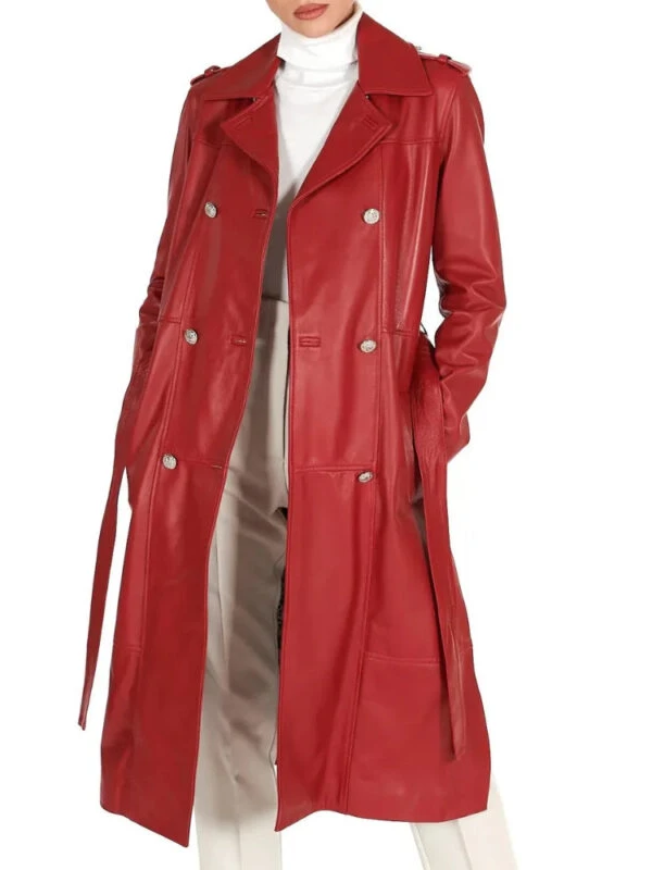 Womens Double Breasted Red Long Leather Coat