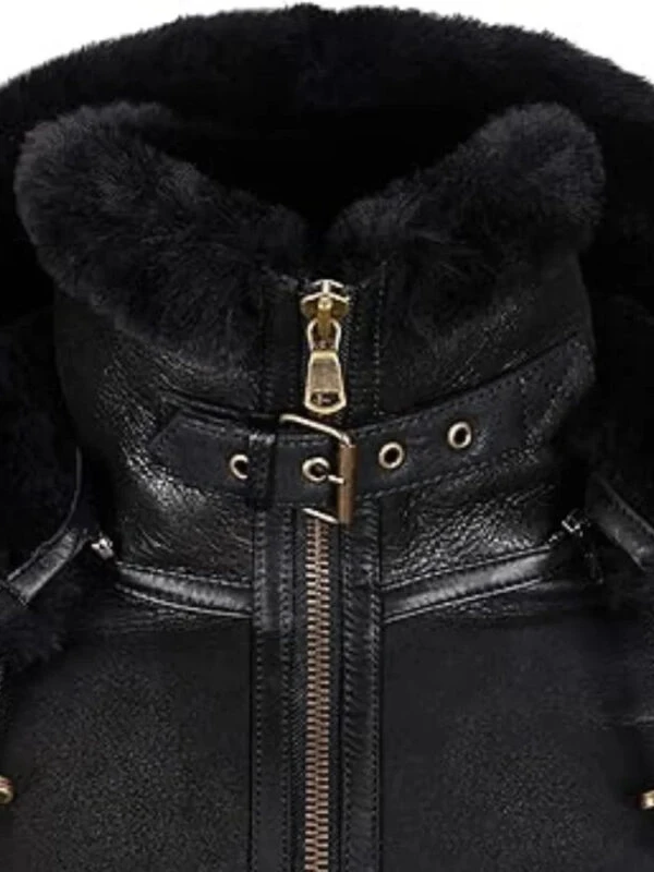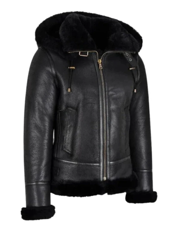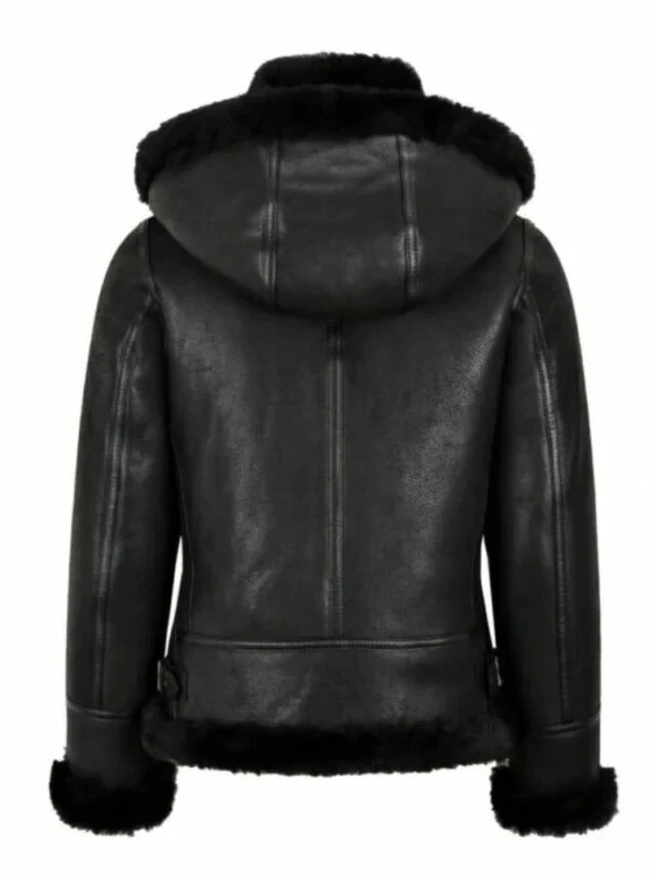 Womens Hooded Shearling Black Bomber Aviator Jacket